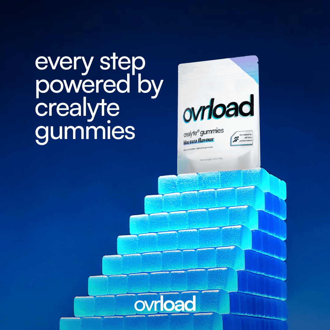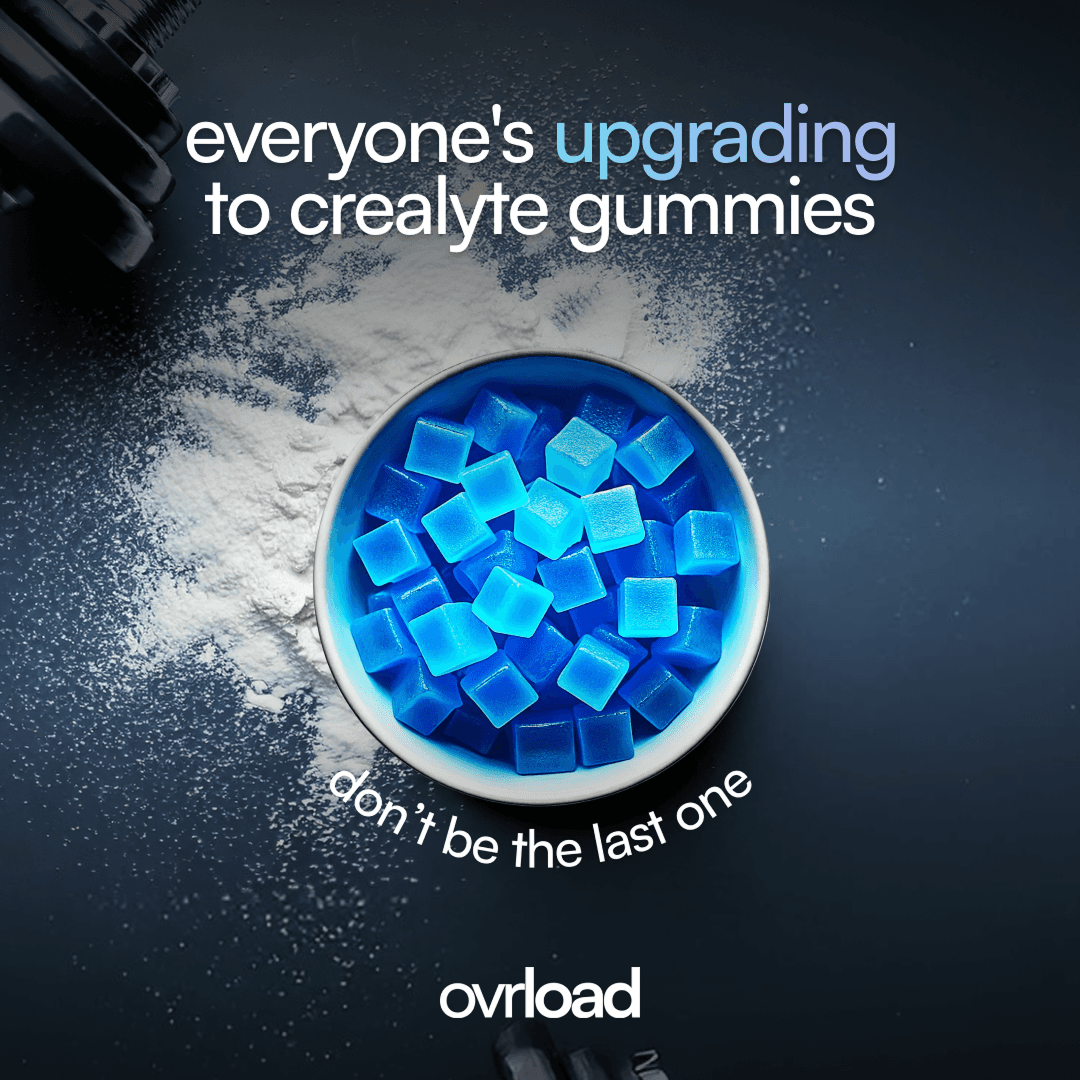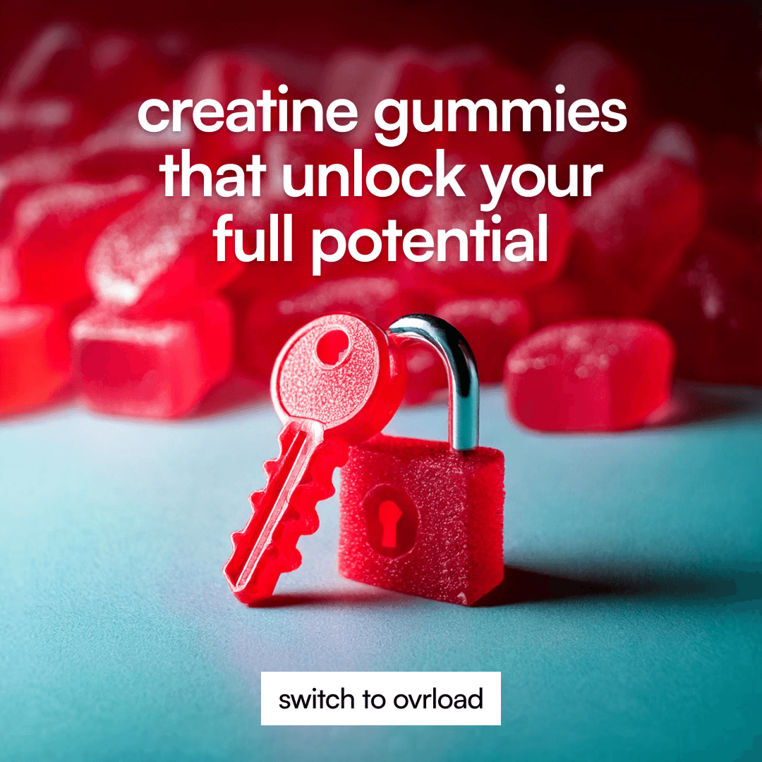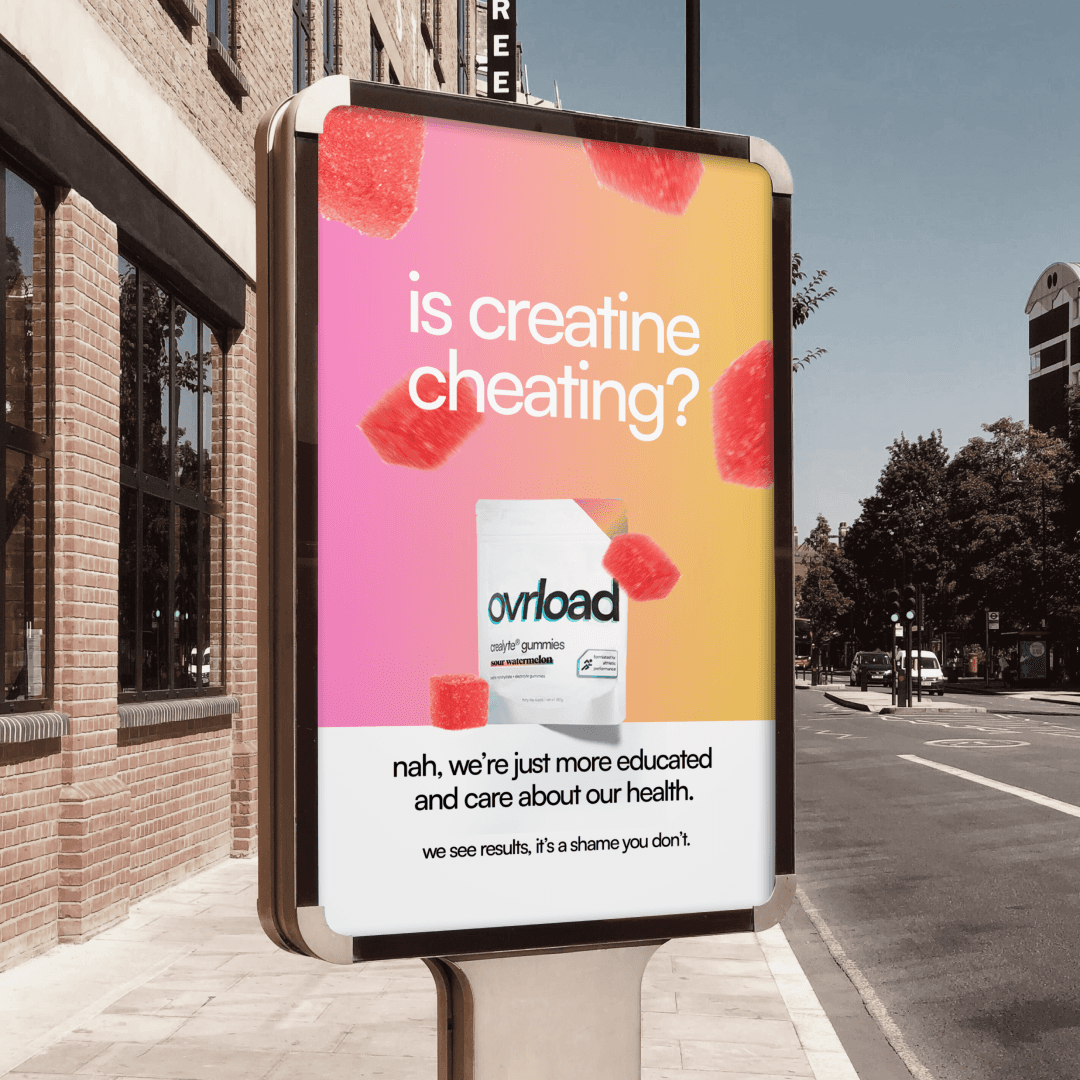 Ad creatives for ovrload, a sports nutrition brand, highlighting creatine performance benefits through bold product visuals and social-first advertising.