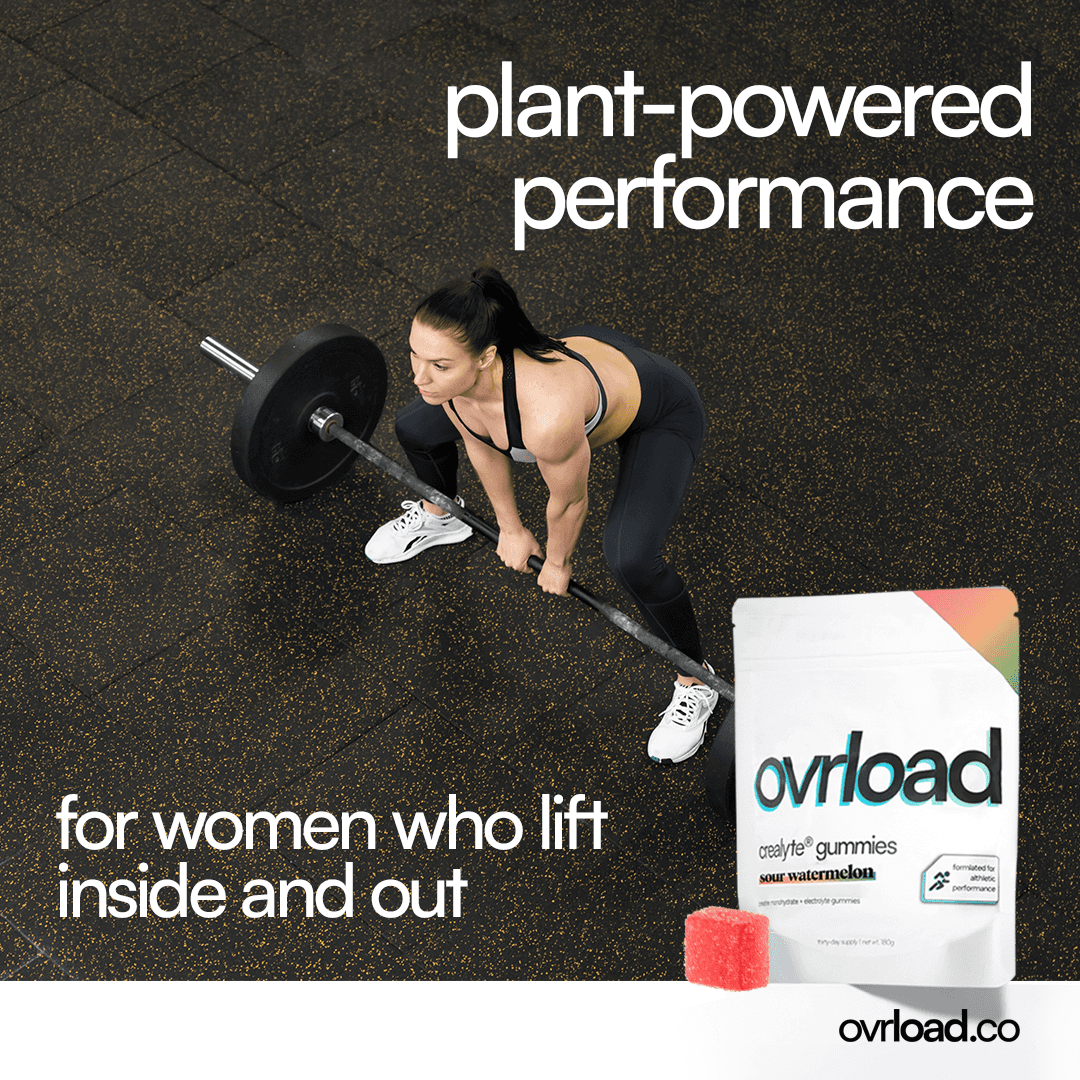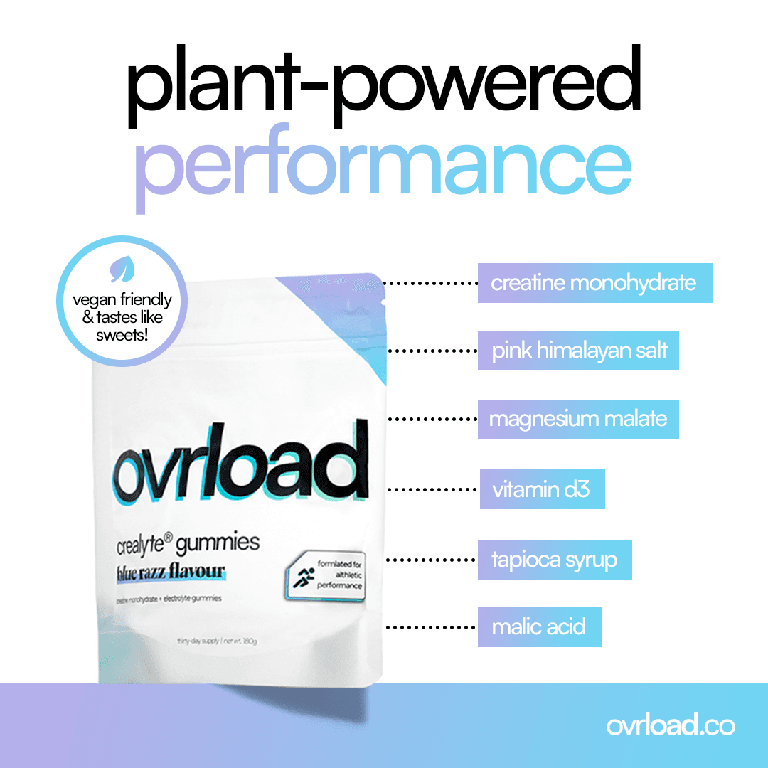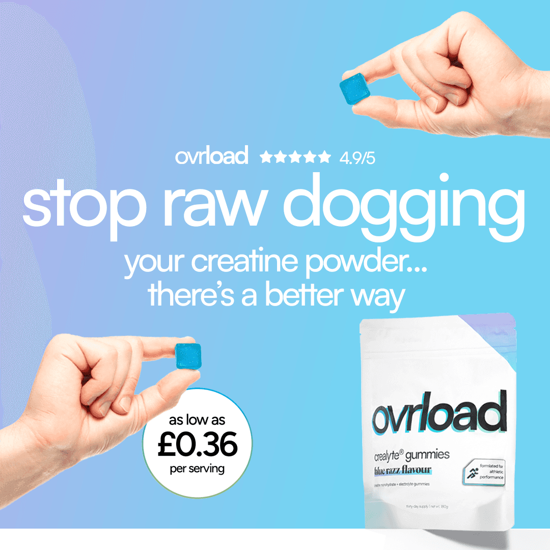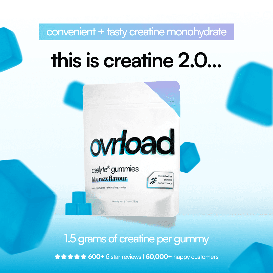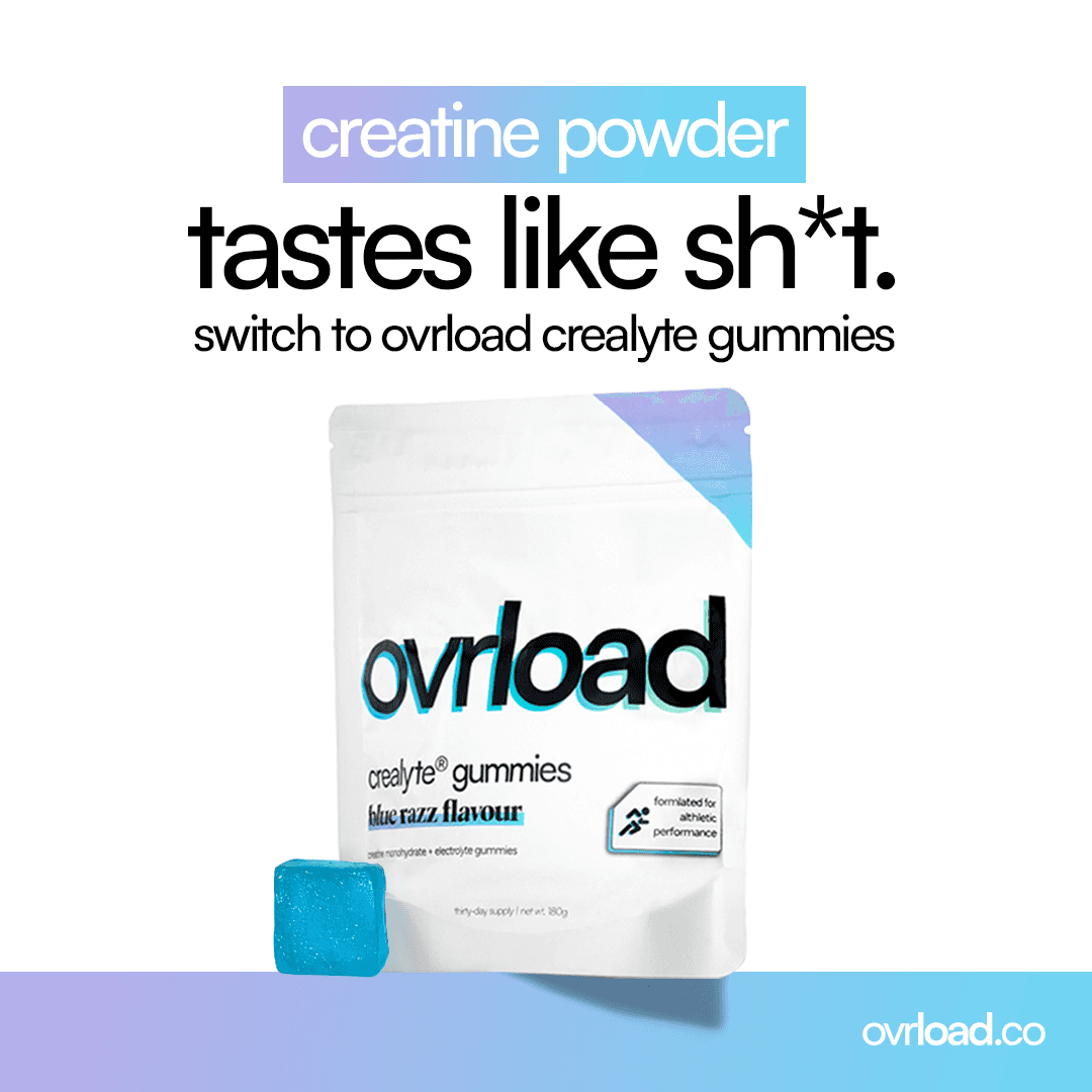Ad creatives for ovrload, a sports nutrition brand, highlighting creatine performance benefits through bold product visuals and social-first advertising.